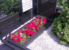 Чуть позже провели работы по озеленению и окраске портрета в цвет. Между могил посадили канадскую ель, очень красивое вечнозеленое растение с густой хвоей. Цветники на обеих могилах засажены цветами. Мраморная табличка с ранее умершими именами нашла свое место сбоку от одного из памятников.