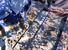 Далее приступаем к установке подставки памятника. После того, как она была возвращена на своё место, размечаем цветник. Параллельно работаем с периметром могилы: по краю пускаем металлическую планку, которая послужит границей брусчатки.